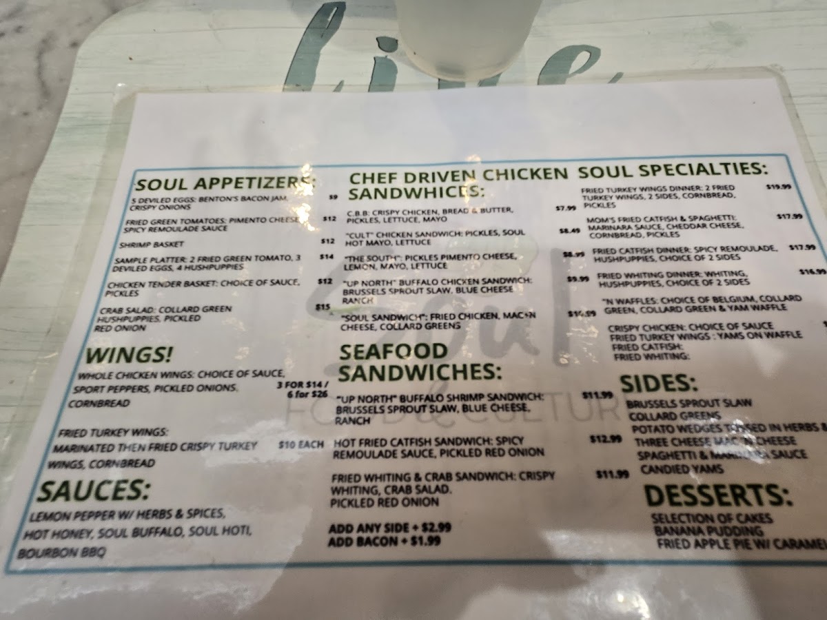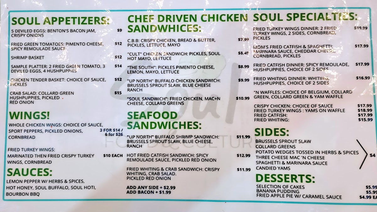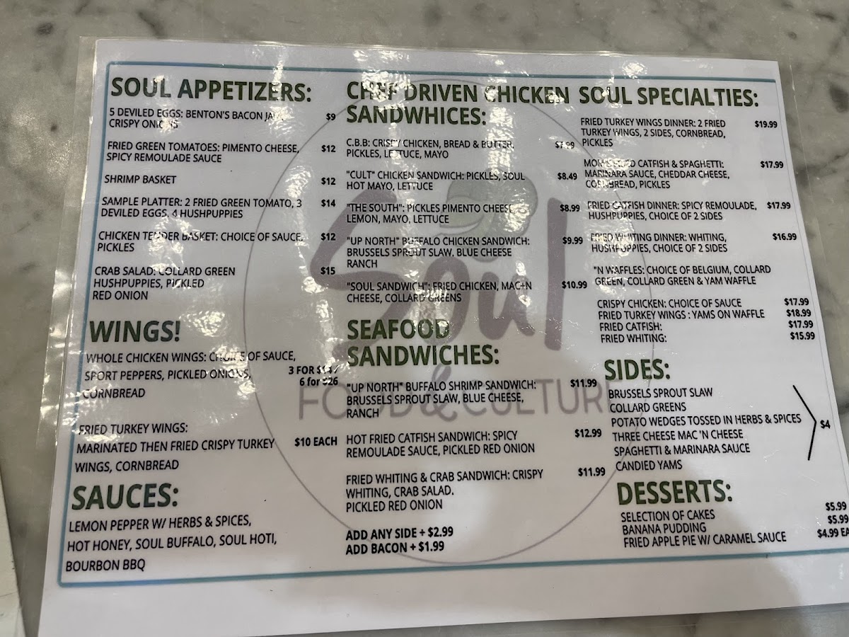 At Soul: Food & Culture Menu, every dish tells a story. Nestled in the heart of Atlanta, this vibrant eatery blends soulful flavors with a rich cultural heritage. From classic Southern comfort foods to modern takes on traditional recipes, there’s something for every craving. Start with their signature appetizers that burst with flavor, or dive into hearty entrees that bring together bold spices and fresh ingredients. Whether you're here for a casual bite or a more indulgent meal, the menu is crafted to provide a memorable dining experience. From flavorful fried chicken to indulgent sides like creamy mac and cheese, each plate is a celebration of the diverse culinary traditions that make Southern food so special.